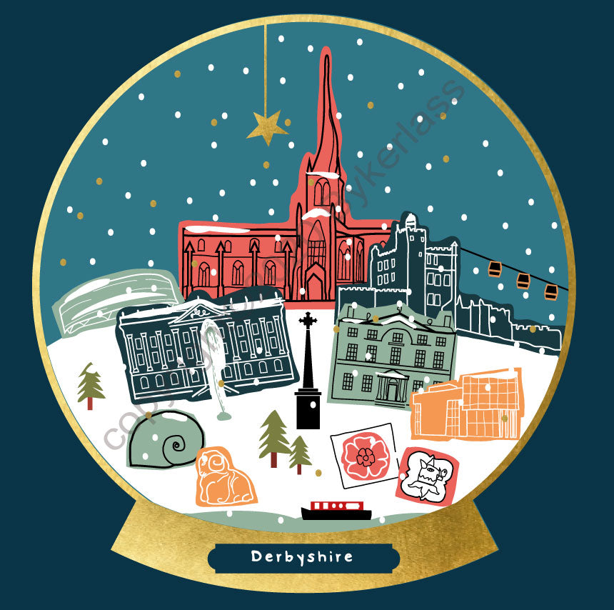 LUXURY GOLD FOILED Derbyshire Snow Globe Christmas Card