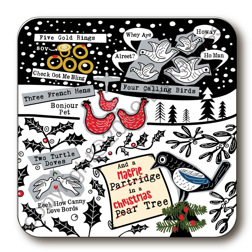 Our fabulous Five Days of Geordie Christmas on a cork backed coaster. 9.5cm square.  Matches our card and Tea towel a great Christmas keep sake.