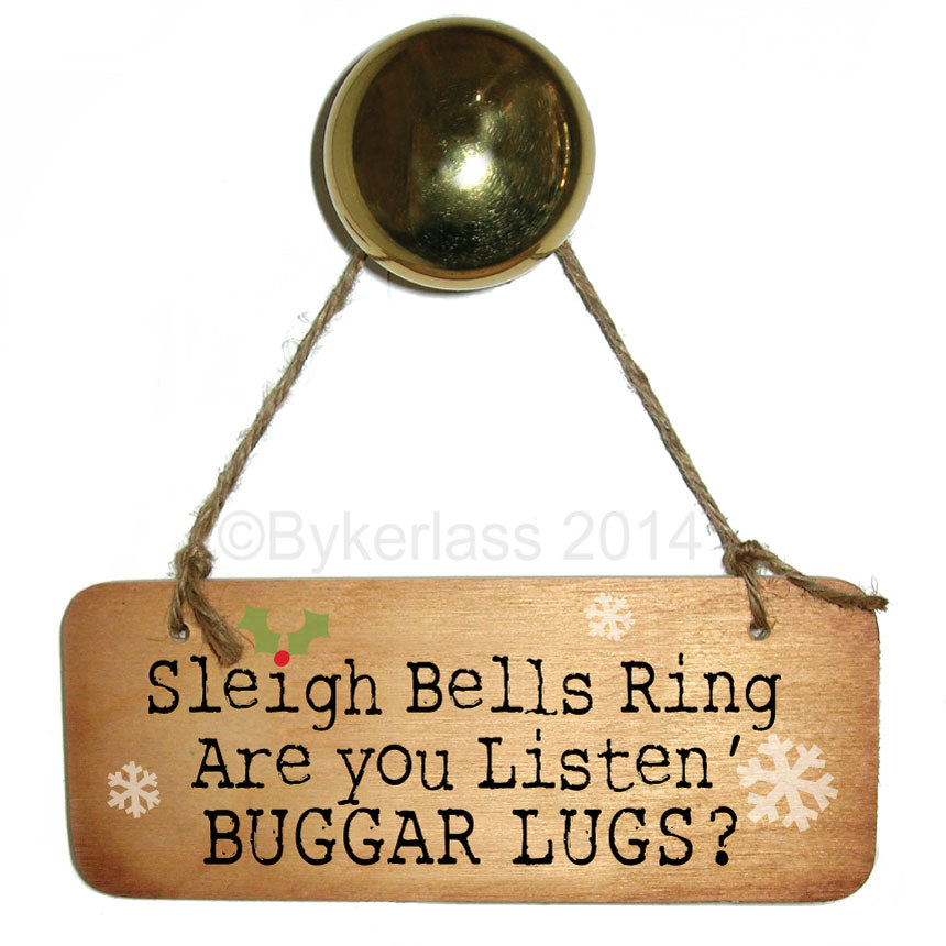 Sleigh Bells Ring, Are You Listening BUGGAR LUGS? Christmas Rustic Wooden Sign - humourous Christmas sign with a slight Northern accent!! We HEART this one!! (there is also a card to match)