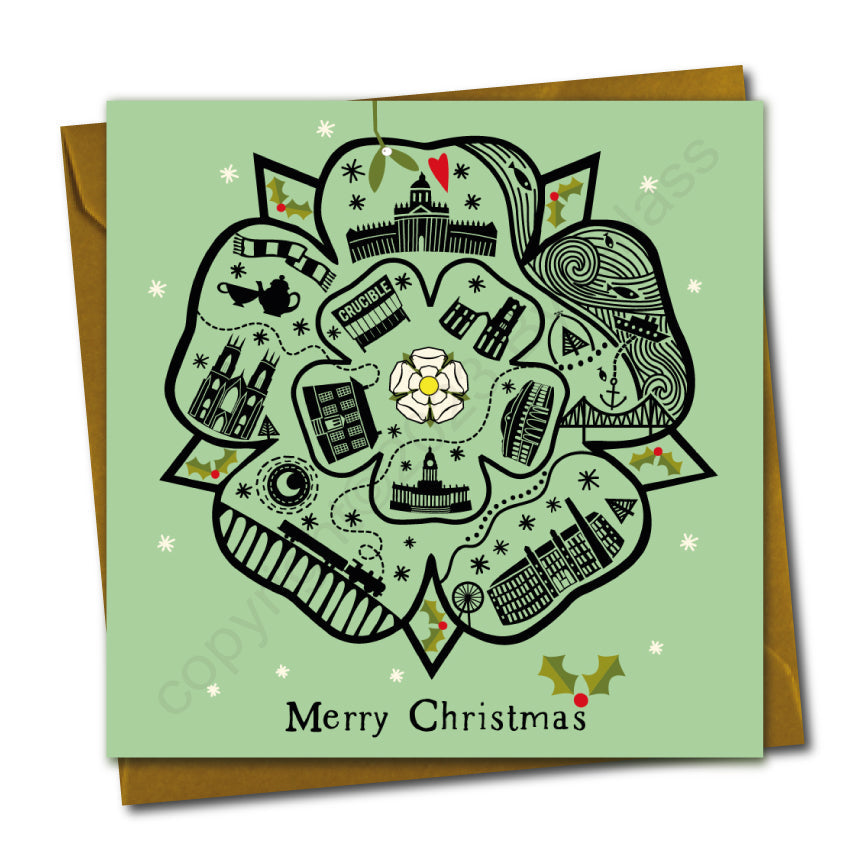 Yorkshire Rose (Green) Line Illustration Christmas Card