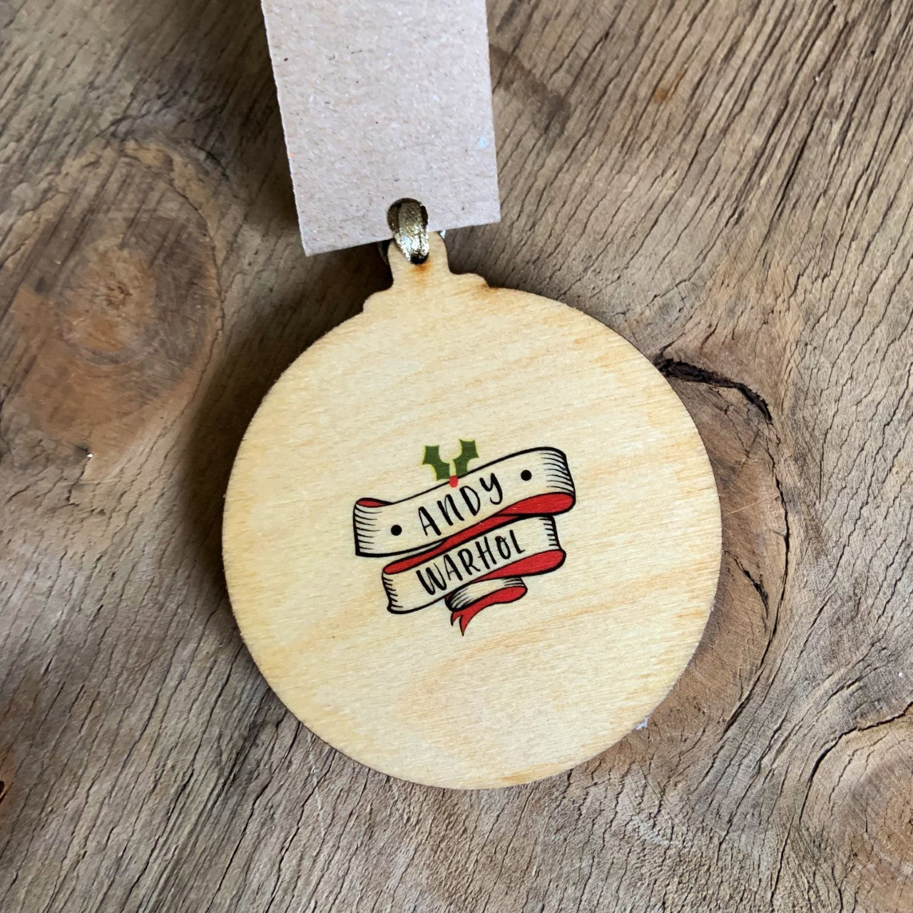 The reverse of the bauble has Andy Warhol in a crest with a sprig of holly.